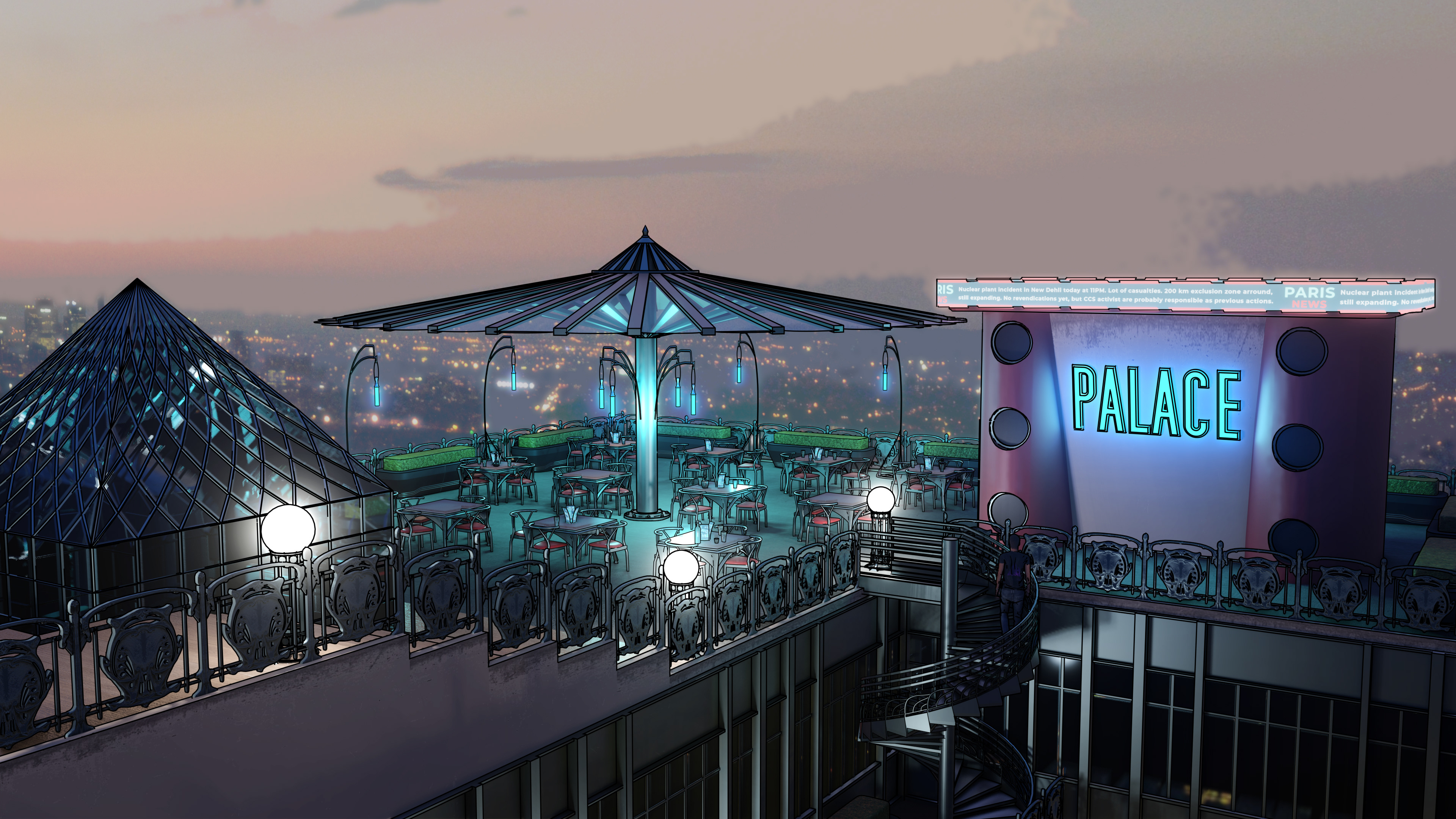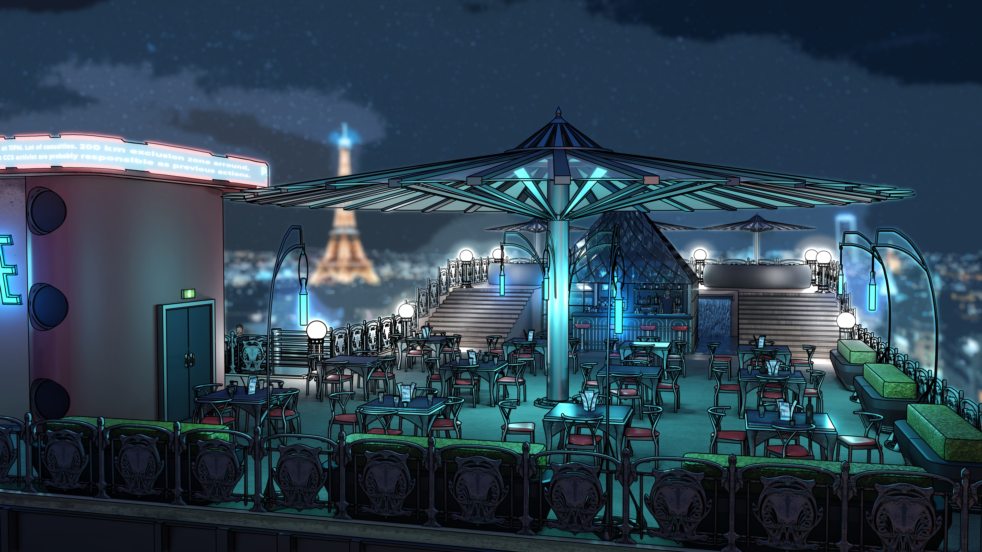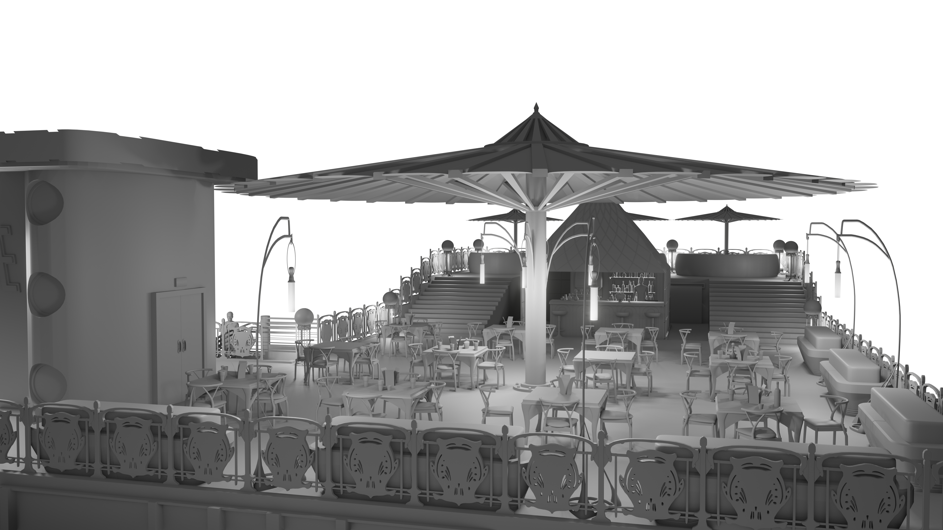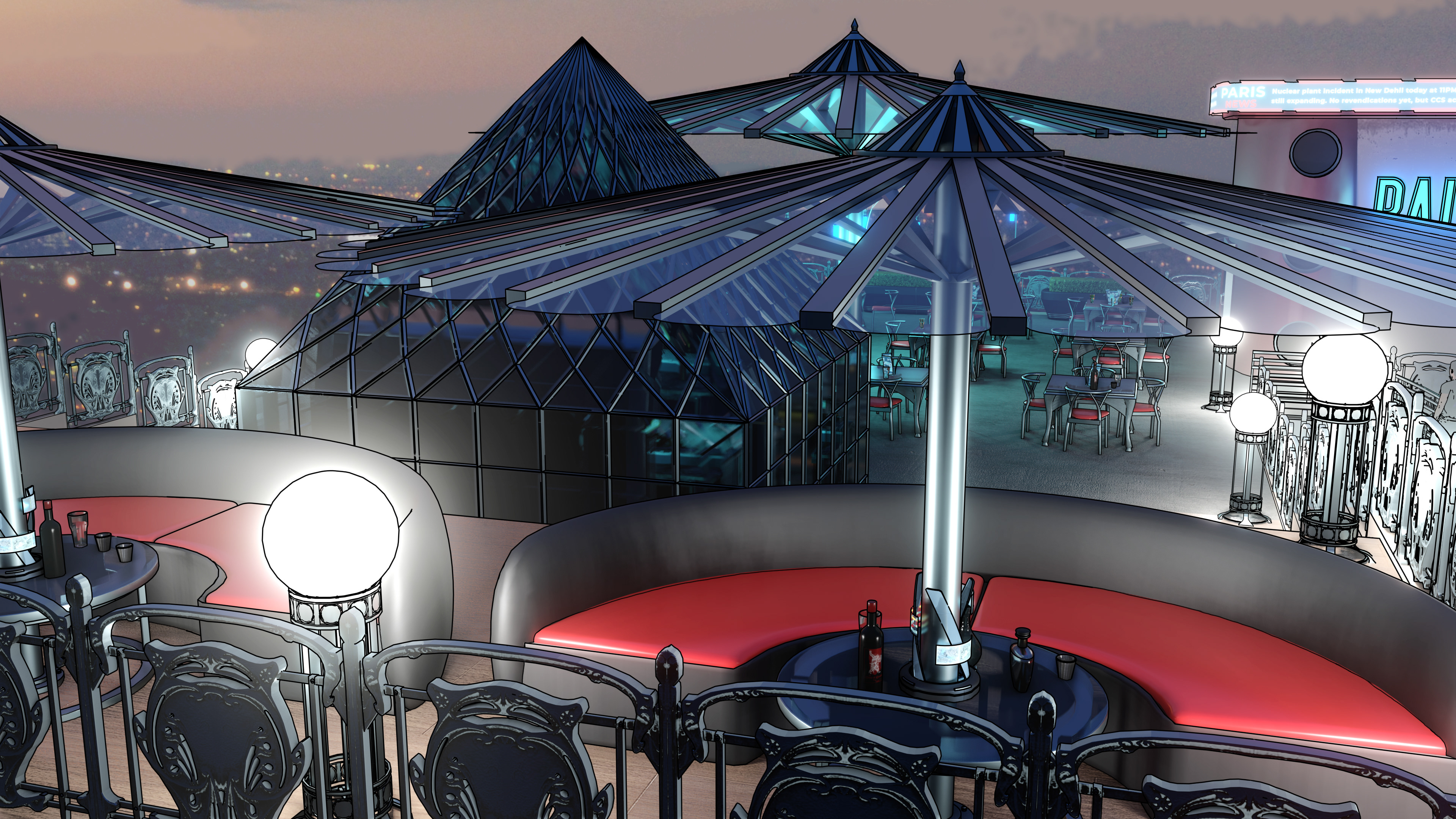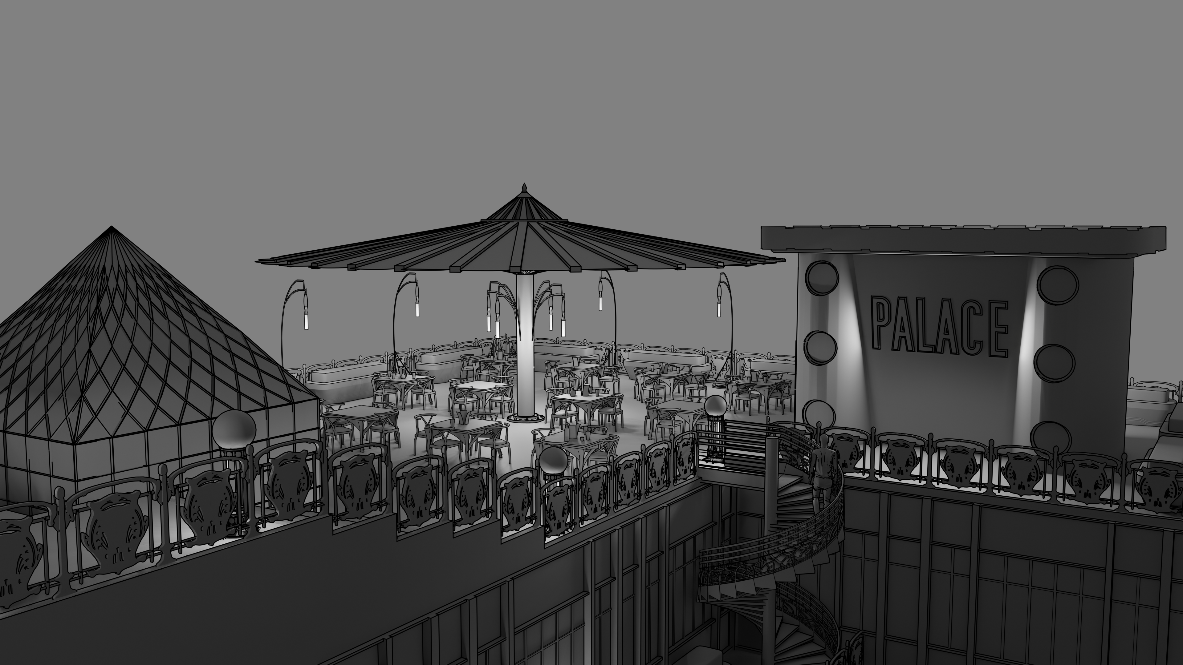 Here is the result from a workshop demo made for my second year game art bachelor mostly. Subject is to make a rooftop design for a slightly futuristic bar for several locations, potentially for a kind of game hub for a fictive project. Obviously my example takes place in Paris with some kind of Art Nouveau overall look. Process is to design props first, modeling them in Blender roughly, generate a greybox render and a freestyle pass to extract a basic line. Then go into Photoshop to composite and refine the line, and make another pass of indirect color, photobashing and stuff.